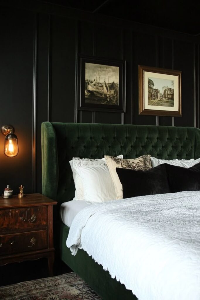 A black velvet headboard screams luxe. Velvet catches light in a way flat paint never will, so your bed instantly becomes the star of your green and black bedroom decor.