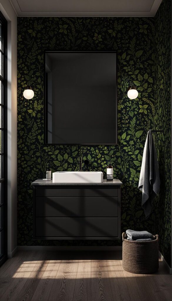 If you want bold without painting the whole room, wallpaper one wall. A black wallpaper with botanical prints feels dramatic, but the greenery keeps it alive and sophisticated.