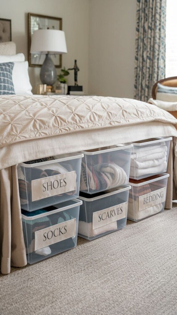 If you already own a normal bed, you can still win here. Use low-profile rolling bins that glide in and out without snagging on everything.