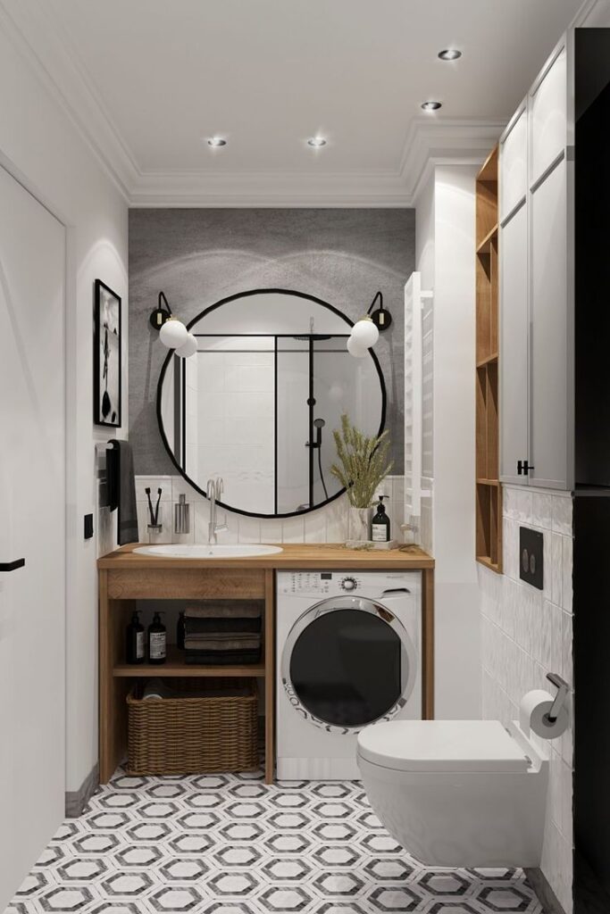 A mirror reflects light and gives your tiny laundry room instant depth. You can hang one on the back of the door, on a side wall, or above a counter if you want a more designed look.