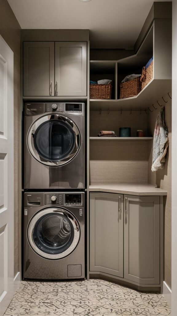 Stacking front-load machines instantly creates breathing room in a very small laundry room. You turn two footprints into one, and you gain space for a slim cabinet, hamper, or folding shelf.