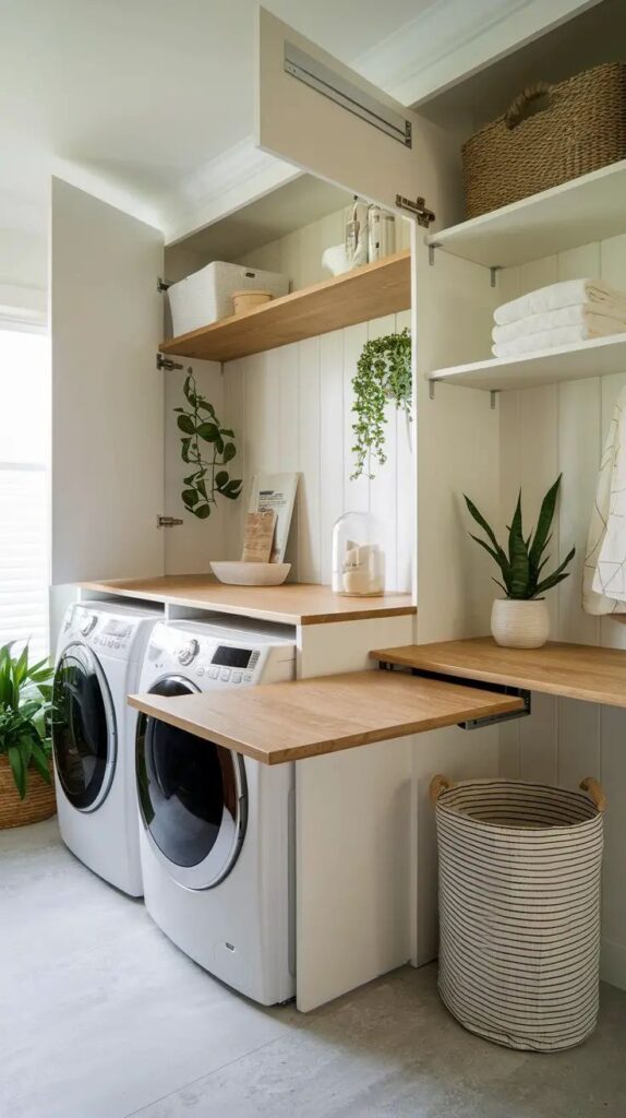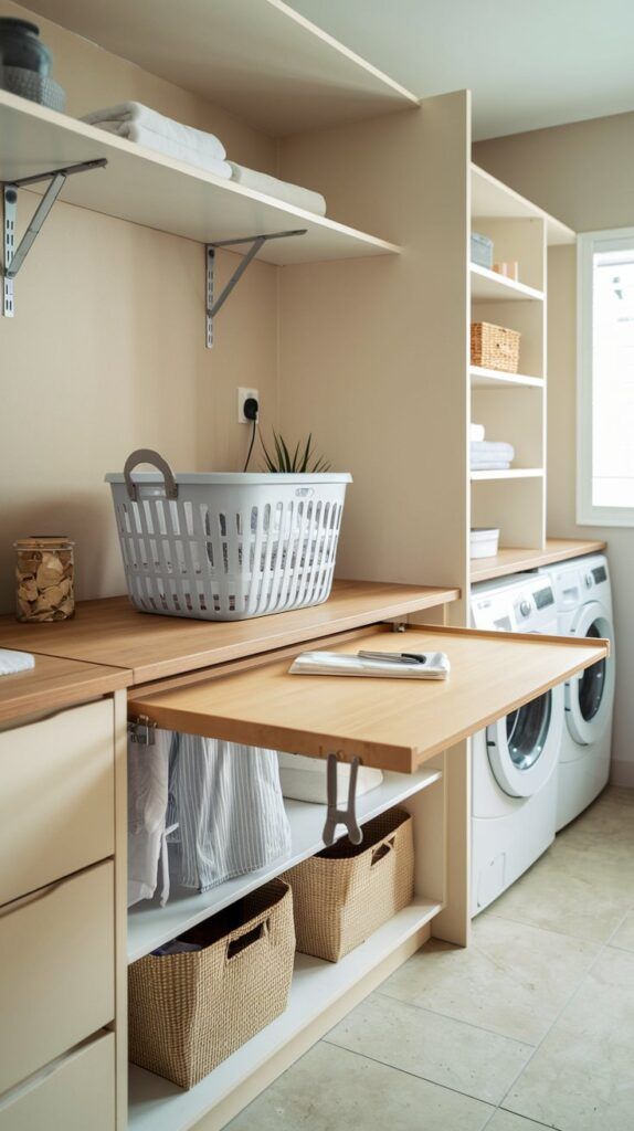 This trick works perfectly in a laundry closet where every inch matters. I love how it keeps the walkway open, especially in tight hall setups. Why let folding take over the whole room?