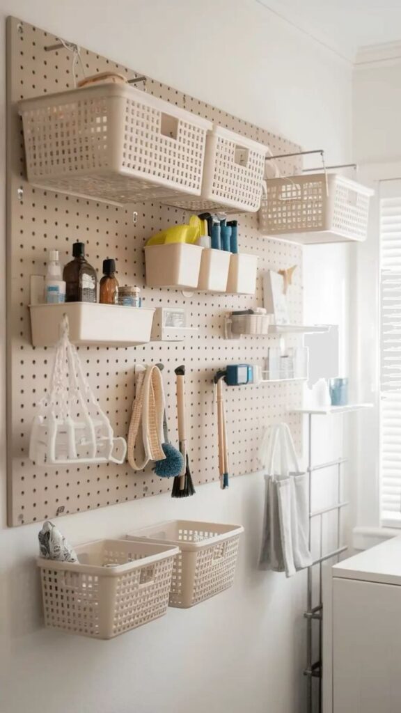 I love pegboards in tiny spaces because they keep tools visible, which means I actually use them. You also free up shelf space for bigger items like towels or baskets. Ever bought a duplicate lint brush because you “lost” the first one? Same.