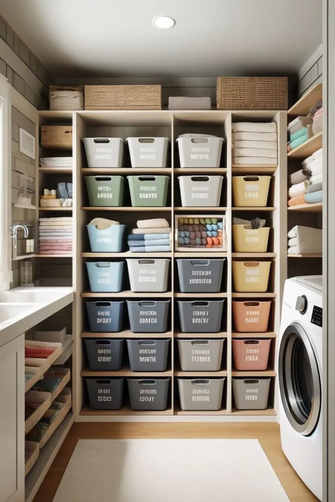 Your laundry room can feel spacious even when it holds a lot—if you hide the busy shapes. Matching bins turn a chaotic shelf into a calm shelf, and labels stop everyone from rearranging things like they play a prank.