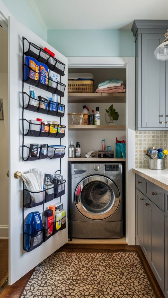 The back of the door offers prime storage in a tiny laundry room. You can hang a slim rack for sprays, cloths, and small items without adding visual bulk to the room.
