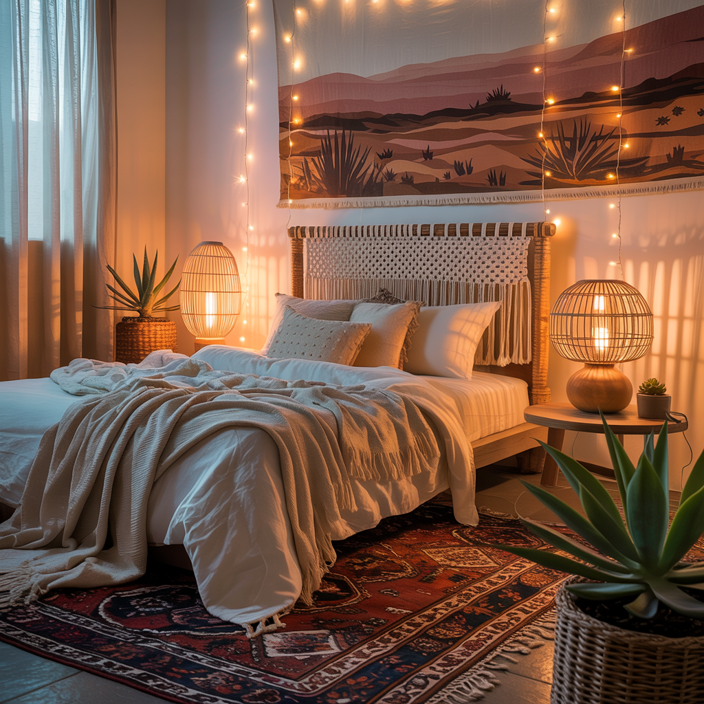 Boho bedrooms need soft, warm lighting. I rely on table lamps, fairy lights, and lantern-style lamps to set the tone. Doesn’t your room feel instantly cozier with warm light?