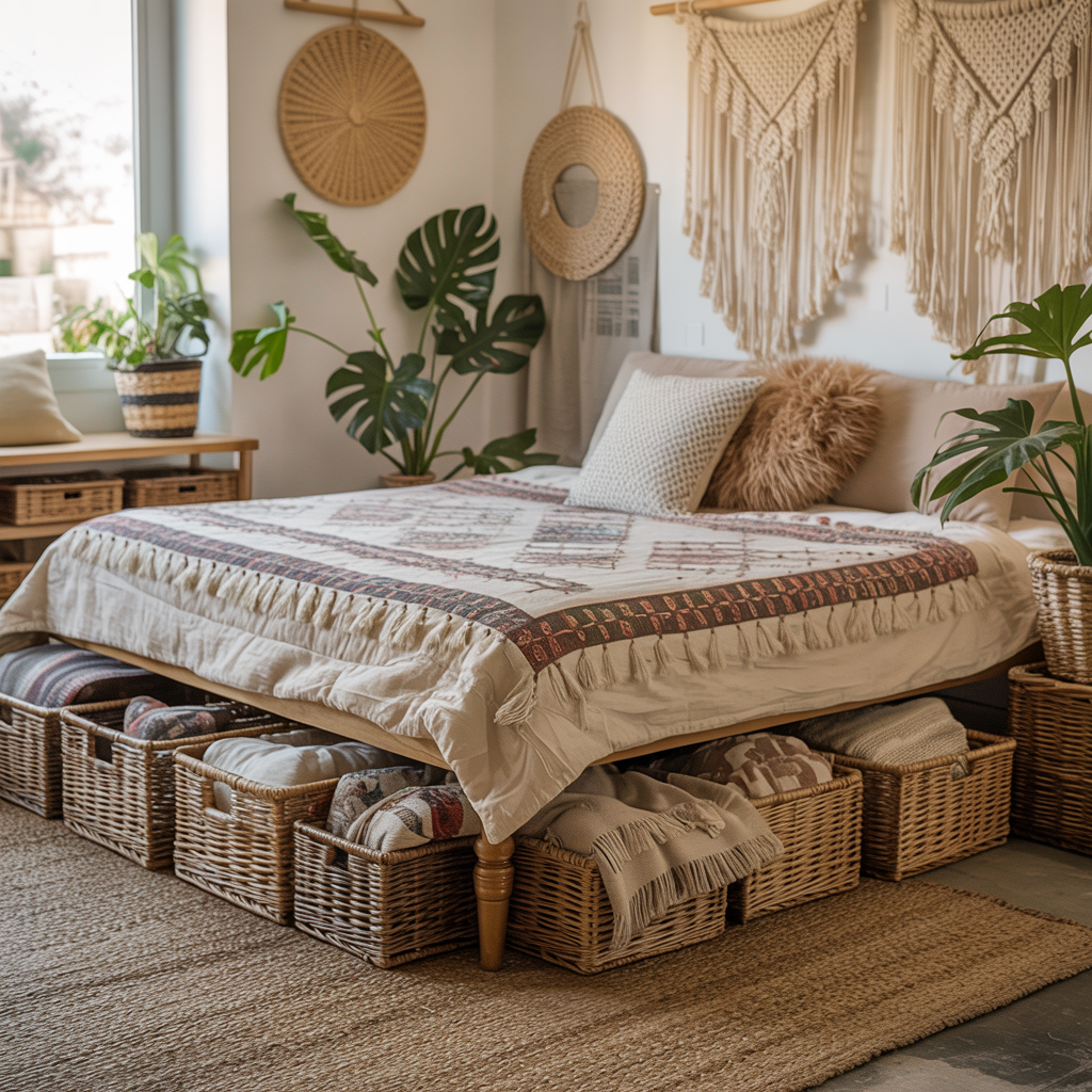 Woven baskets hold blankets, pillows, or random stuff you don’t want visible. I tuck them everywhere, and they always add that effortless boho charm.