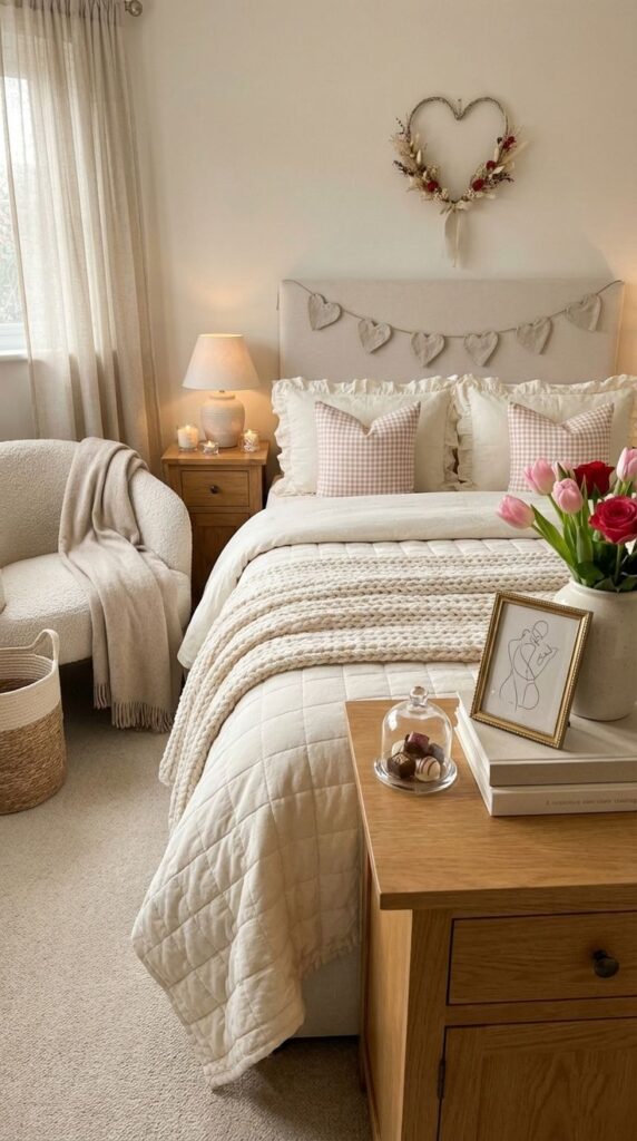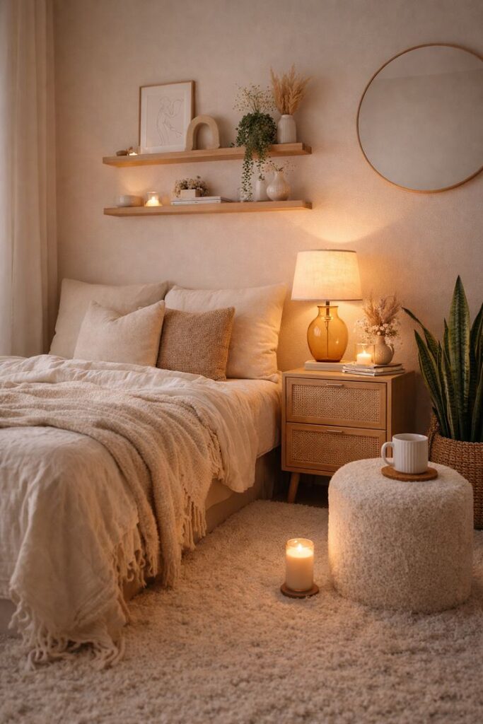 - Soft accent light (fairy lights, small table lamp, or candle in a safe holder)