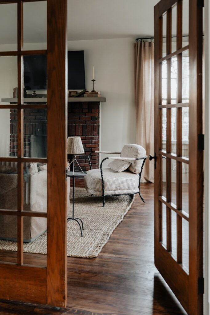 Think black-framed, Crittall-style glass or simple framed panels. They separate the living room visually and acoustically while keeping everything bright.