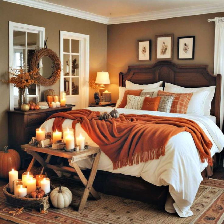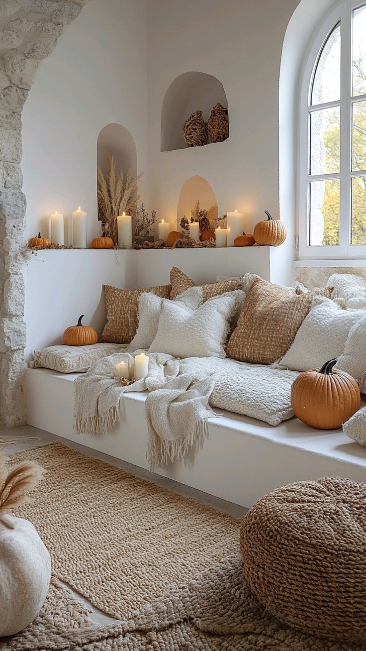 Keep the big items neutral and bring color through smaller decor. You’ll get that autumn feel without feeling trapped in a pumpkin-themed snow globe.