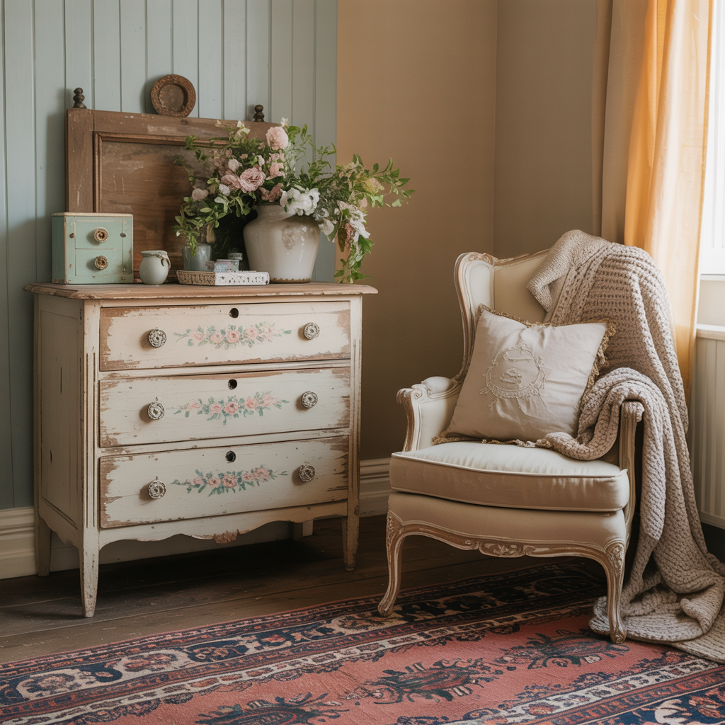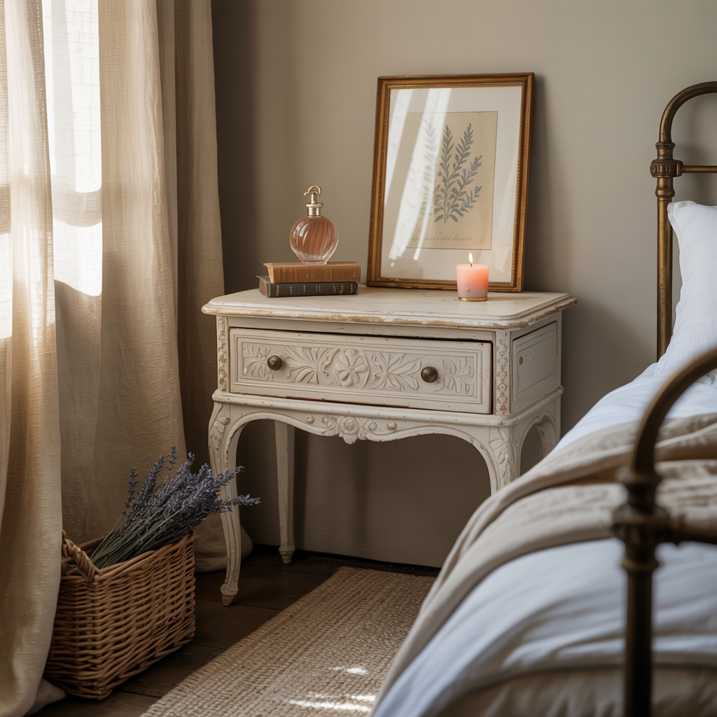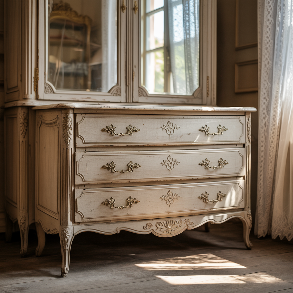 I always choose furniture with a few scratches. Perfect furniture feels fake. Real life leaves marks, and French vintage celebrates that.