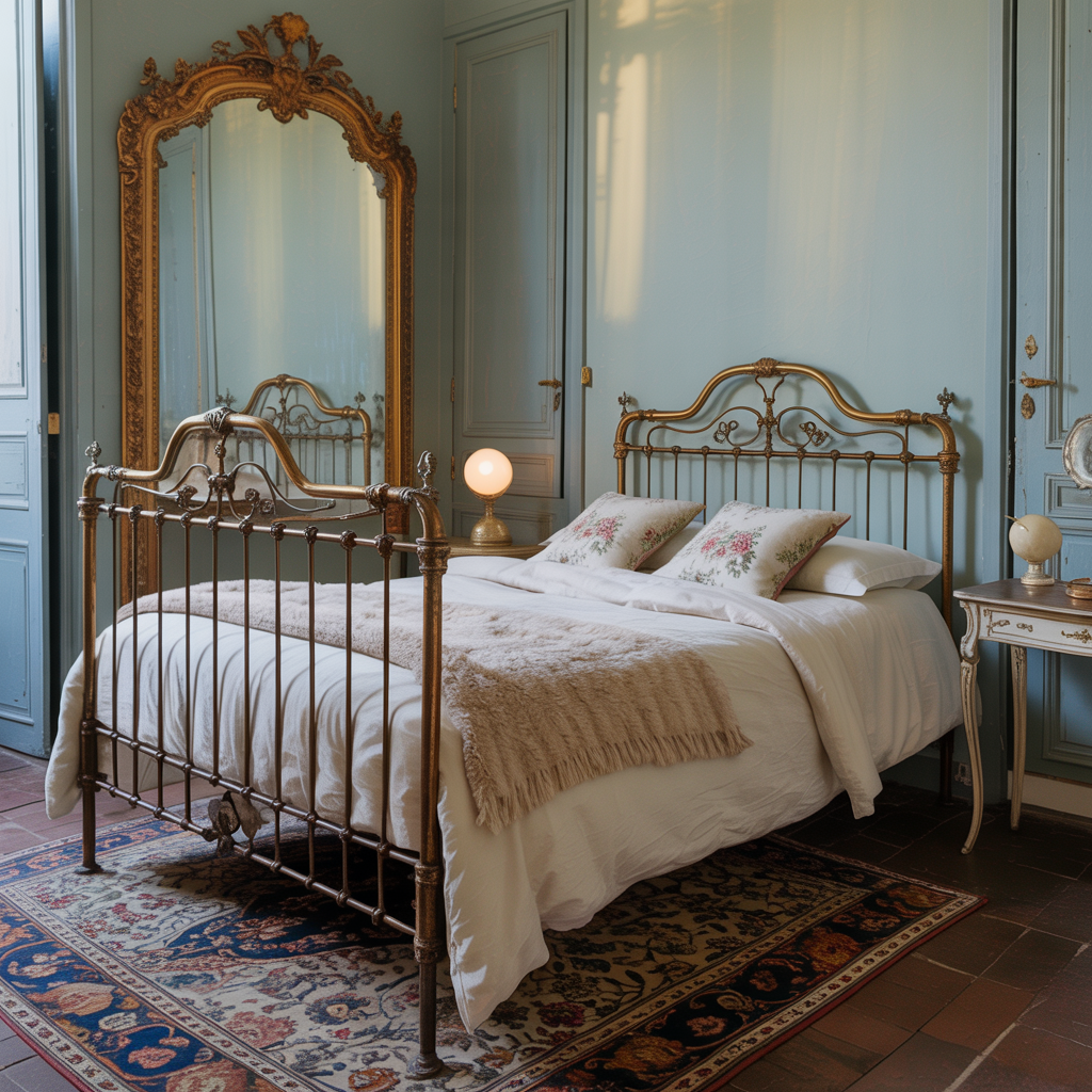If you want one dramatic piece, make it the bed. A French vintage bed sets the tone faster than anything else.