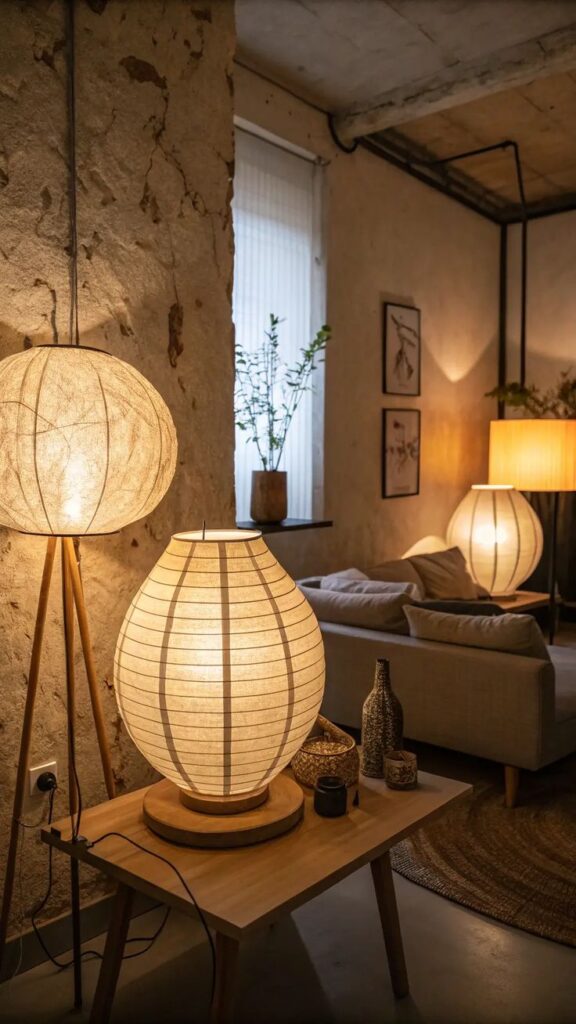 Harsh overhead lighting ruins the mood faster than a surprise work email. Use layered lighting so your apartment feels gentle at night.