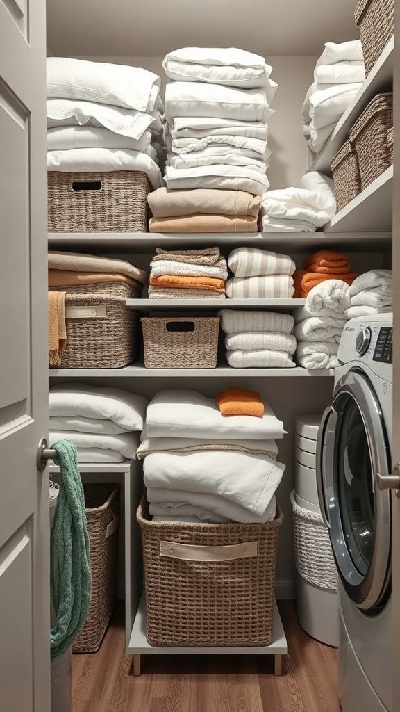 Grab a trash bag and a donate box, then clear anything that doesn’t directly support laundry. Why store mystery candles and old paint rollers next to detergent? Your towels didn’t sign up for that.