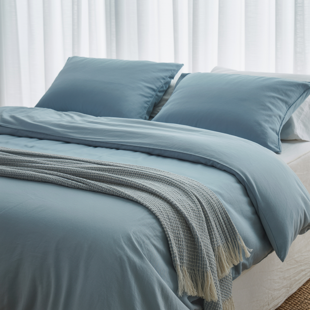 Soft blue sheets create an instant minimalist vibe. I prefer solid colors over patterns because patterns add visual noise.